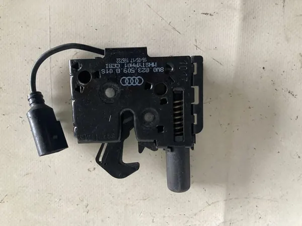 Motorhuvudlås för AUDI Q5 FY 17 - 21, delnummer 80A823509A. Denna begagnade del visar tecken på slitage. Det är en originaldel med tillverkarens logotyp (OEM, OES). Lämplig för personbilar. Faktura finns.