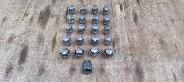 Komplett set med hjulbultar för Range Rover Evoque L538, lämpligt för modeller producerade från 2015 till 2018. Setet är i visuellt skick som visas på bilderna, utan defekter eller skador. Bilderna representerar noggrant det faktiska visuella tillståndet för delarna. 100 % originaldelar. OEM-nummer inkluderar LR001381, 6G921K024AD och andra. Produktens vikt med förpackning är 1 kg.