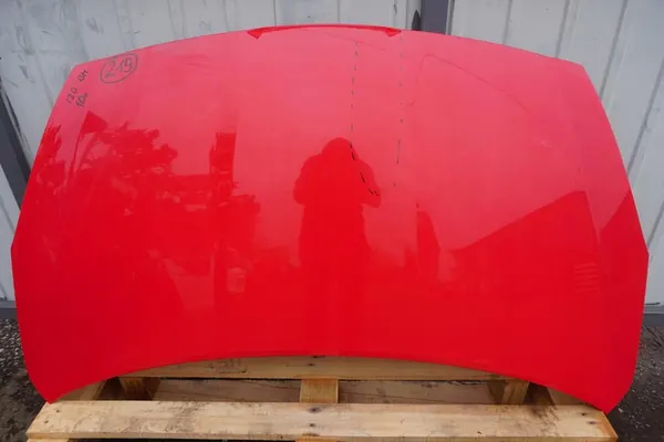 Motorhuv för HYUNDAI i20, modell CNW5D1615, år 2010, röd färg. Delen är begagnad och är en original OEM-del med nummer 664001J000. Bilden visar den faktiska utseendet av delen. Kontrollera kompatibiliteten med din bilmodell innan köp.