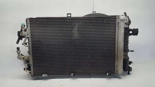 Komplett kylare och fläkt för OPEL ZAFIRA II B 1.6 Z16XEP. Enheten är begagnad, fullt funktionell och tät. Kompatibel med manuella transmissionsfordon. OEM-delnumer inkluderar 13205947, 13147276 och 13205941.