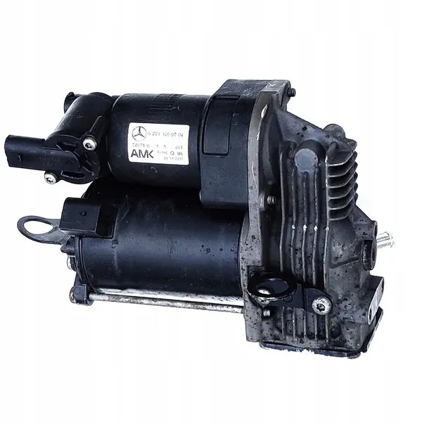 MERCEDES AG fjädringskompressor, OEM A2213200704. Detta är en begagnad del från AMK, original med fordonstillverkarens logotyp. Produkten väger 4 kg och levereras med en moms faktura. Den totala vikten med förpackning är 5 kg.