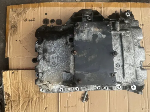 Original oljetank för Mercedes-fordon med 4MATIC-system. Denna del visar slitage där lagret är säkrat på axeln och har en skadad krage. Det är en begagnad del, klassificerad som originalkomponent med tillverkarens logotyp (OE). Delnumret är A6510142802, lämplig för dieselmotorer. En moms faktura kommer att utfärdas på begäran.