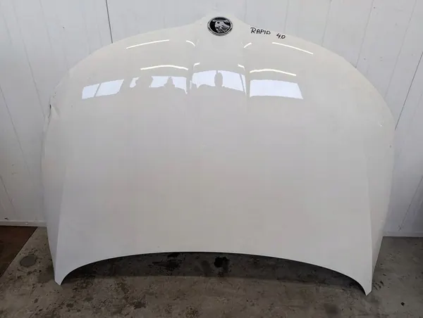 Motorhuv för Skoda Rapid-modeller från 2012 till 2019. Huvan är skadad på ett synligt ställe som visas på bilden. Denna del är original och har inte reparerats.