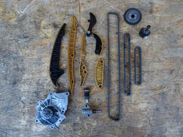 Timingkedjesats (guide, kedja, spännare, remskiva, vattenpump - komplett sats som visas på bilderna) lämplig för: VOLKSWAGEN GOLF VII R 2.0 TFSI 4MOTION efter facelift 2016 - 2020 med artikelnummer: 06L121012A, 06L012A, 06H105209AT, 06K103319N, 06K109467, 06H109467AR, 06H109509Q, 06K109469M, 06H109469AH, 06H109469AQ, 06H109509P, 06K109469N, 06K109507F. Motor kod - DNU DNUE. Använd, original, i mycket bra skick - borttagen från ett fordon med 8 000 km körsträcka från 2019. Funktionell. Bilden återspeglar det faktiska tillståndet för objektet.