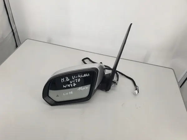 Begagnad vänster spegel för Mercedes Vito, synlig på bilderna. Detta är en originaldel från Europa med tillverkarens logotyp (OE). Delnumret är A4478104401.